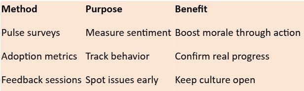 Data matters, but it’s not the whole story. Consultants blend numbers with human feedback — tracking how change feels, not just how it performs. Metrics show patterns; conversations explain them. Together, they form a complete picture.