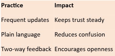That honesty steadies people. Leaders feel more grounded in their message, and employees stop bracing for surprises. Consultants also push for real dialogue — open feedback loops, not one-way updates. When communication moves both directions, trust builds almost automatically.